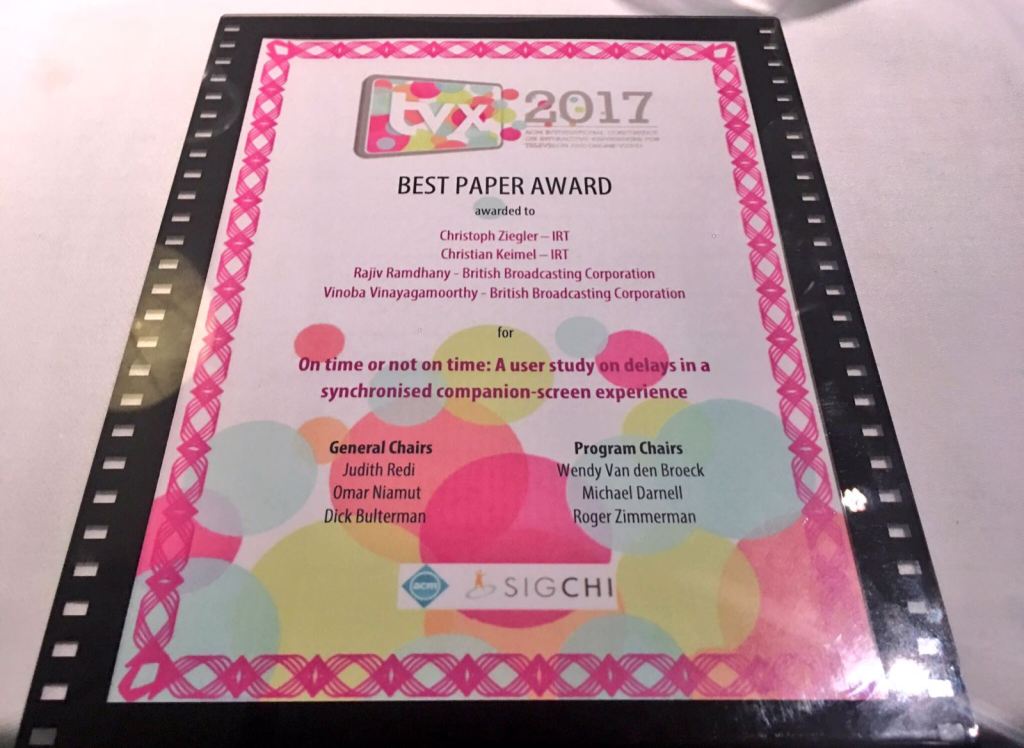Details of the project is available in my TVX 2018 paper and related details about the system can be read in my TVX 2016 paper (which won an honourable mention for the best paper award). I supervised two Masters students (Christoph Ziegler from LMU and Wei Liang Kenny Chua from UCL) in very similar ideas. Their projects are detailed in a TVX 2017 paper (which won the best paper award) and a TVX 2017 poster paper. I was also involved in demonstrating the concept of companion screens and the underlying standards (DVB-CSS / HbbTV 2.0) work that makes it possible at IBC where it was featured on ‘what caught my eye’.
