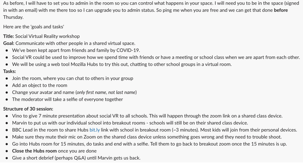 I organised each school of kids to be supervised by 2 colleagues from R&D in the virtual room. I gave a set of easy-to-understand mission to the kids, just before they were invited to go into the virtual room using their own personal devices. These were:
