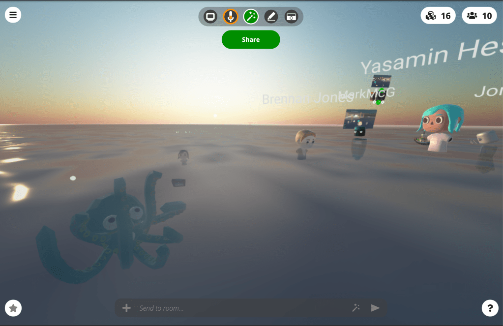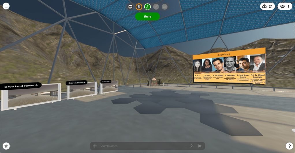 For the purpose of hosting the workshop, the virtual environment was made of one large communal space and three connected breakout rooms. However, the move to a virtual-only workshop, presented an opportunity to investigate how participants (primarily on laptops) behave in a VE built for a specific purpose.