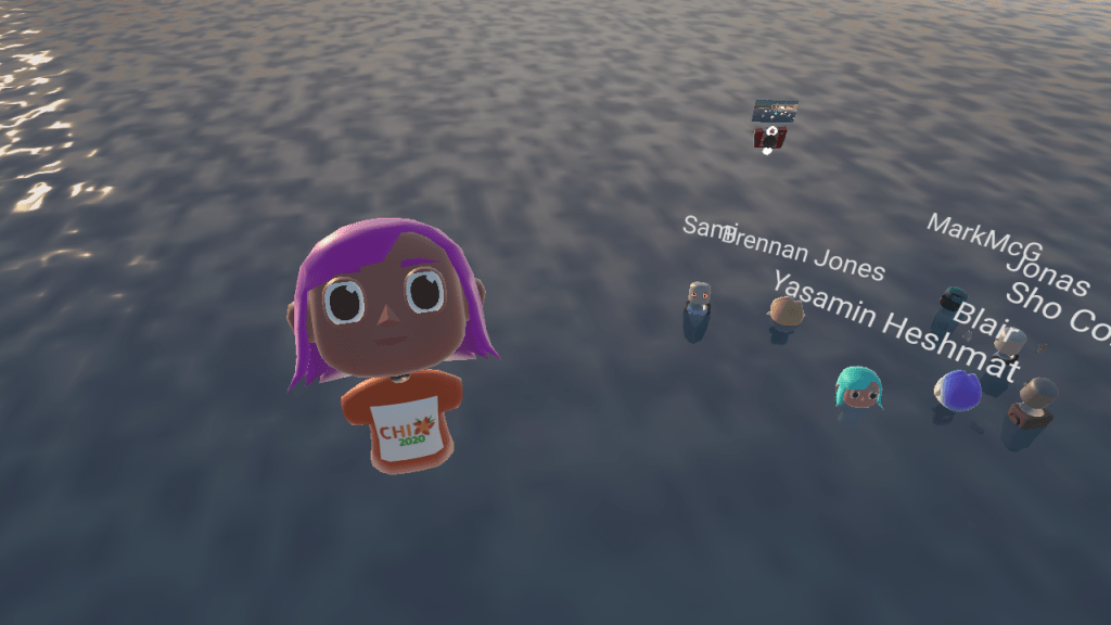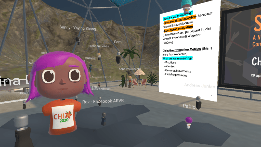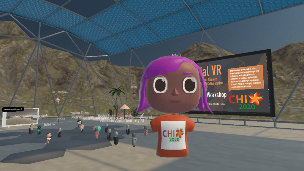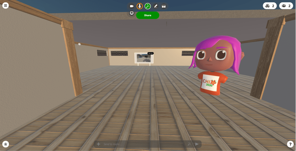 The half-day workshop was over-subscribed and was one of a few workshops that participants could attend despite the conference (CHI 2020) being cancelled. Prior to the workshop, we ran a familiarisation day in which participants could login and explore a training virtual environment. Participants were encouraged to use the controls to move and “fly” in the virtual space, toggle “spatial” audio on/off, and upload files in order to present their presentation slides. Most of the participants also took the time to customise an avatar to represent themself at the workshop. It was a common ice-breaker topic to begin conversations in the workshop.