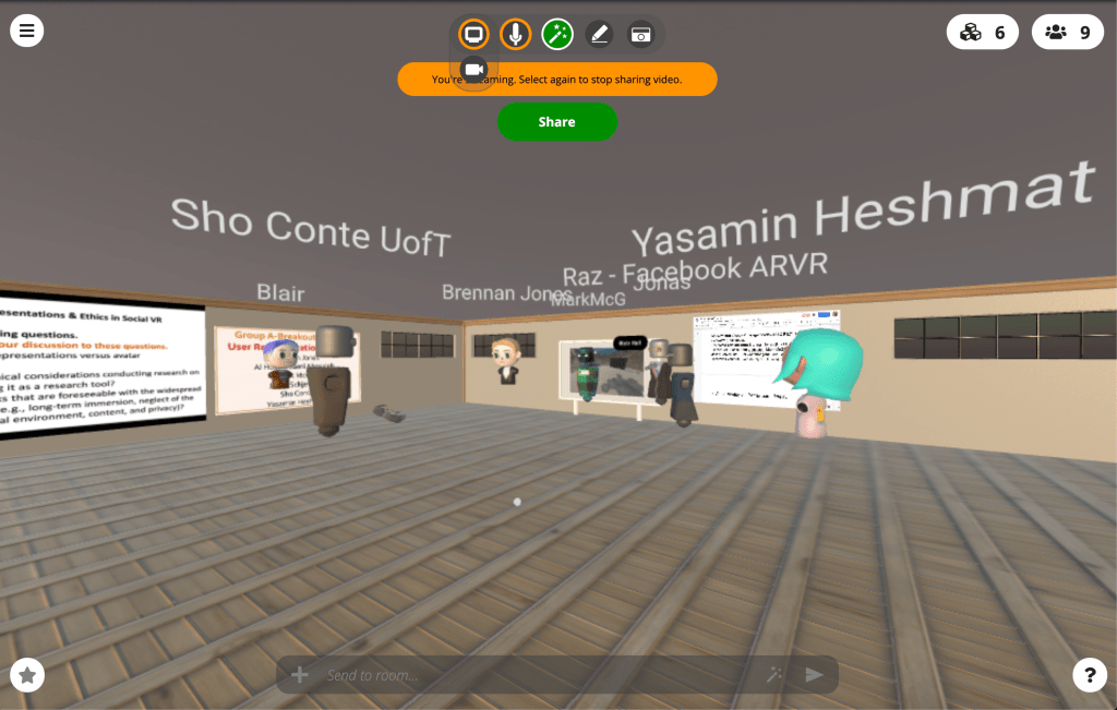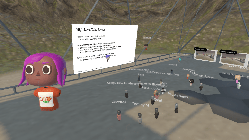 Each one of the three breakout group was also assigned a ‘host’ (ourselves) in order to take notes and help moderate discussions. Each breakout group were assigned one of three topics. In 2020, the subject topics were user representation & ethics, evaluation methods, and interaction techniques. In 2021, participants tackled social cues, interaction techniques and personal space & VE design.