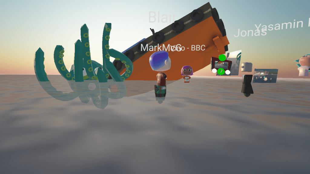 Turns out that that proxemic interactions in VEs, at least in an academic workshop, are congruent with those in a physical space minus the ability to fly. Similar to interactions in the physical world, the group formations formed by our workshop participants adapted to the virtual room size and self-formed familiar conversation clusters. Full details of the analysis of participant behaviour can be read in a CHI 2021 paper. You can also have a go at looking at the data. Ayman released the logger we used in the workshop. Julie presented the work, on our behalf, in a Mozilla Hubs version of Japan.